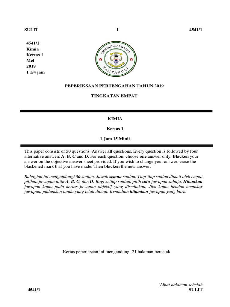 Peperiksaan Pertengahan Tahun Tingkatan 4 Kimia Kertas 1 2019 Pdf